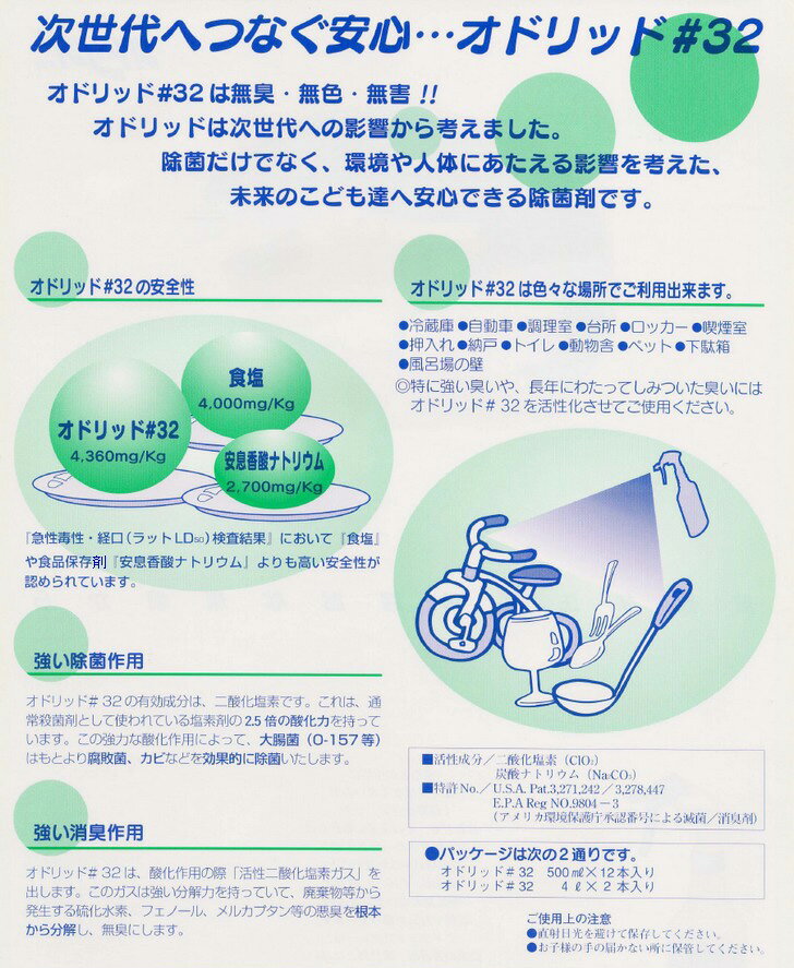 商品名 オドリッド#32 4L(2本セット) 商品詳細 無臭・無色・無害と3要素が揃った、環境や体に優しい次世代と考えた除菌剤! 私達の生活になくてはならないのが、【新鮮な空気】です。